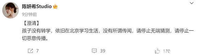 陈妍希工作室发文澄清,表示:“孩子没有转学,依旧在北京学习生活,没有所谓传闻,请停止无端猜测,请停止一切恶意传播。 ”