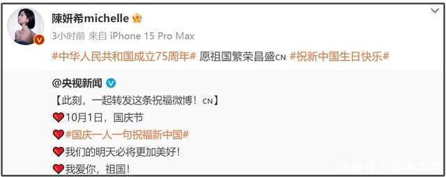 但其实陈妍希嫁到内地之后,一直就表明了自己的态度和立场,每到国庆节日都会转发祝福祖国生日快乐。