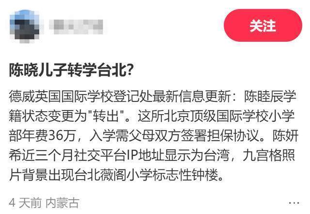 陈晓陈妍希官宣离婚之后,相关后续话题不断。近日,还有消息传出陈妍希给儿子转学,返回台湾省就读,疑似打算搬离内地返台生活,离开伤心之地。随后,台媒还火速进行报道。